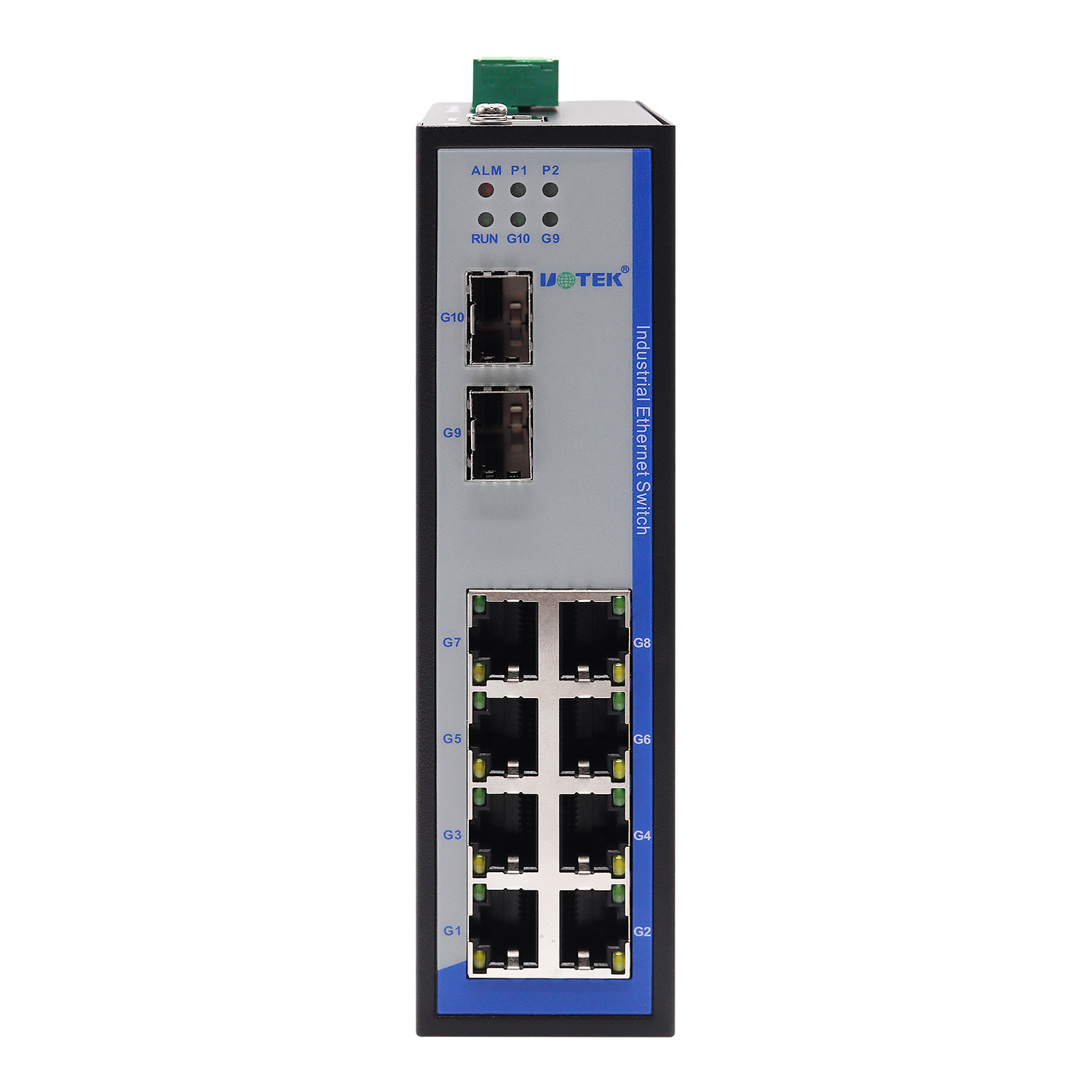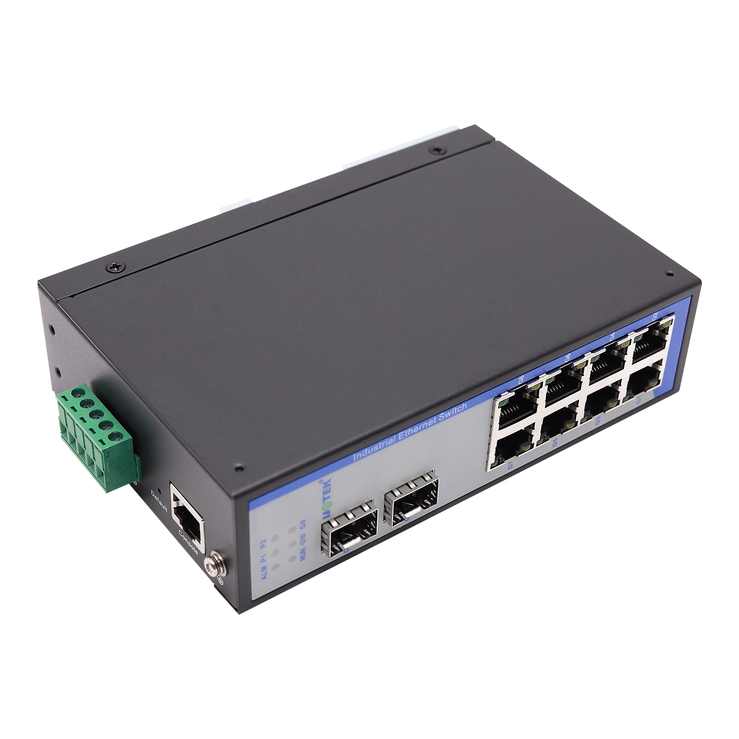 UT-CN60-10GKWF-8GT2GP是网管型工业以太网交换机,支持2路千兆光口和8路千兆电口,支持一路console口,支持Web管理;支持工业现场所需的以太网二层协议,保证通信网络的稳定性;该系列交换机采用低功耗、无风扇设计,确保无噪声干扰,同时支持-40~75℃工作温度和良好的EMC电磁兼容性能,保证在恶劣的工业环境中保持稳定的工作,为工厂自动化,智能交通,视频监控等工业应用领域组建快速稳定的网络终端接入网络提供安全可靠的解决方案。